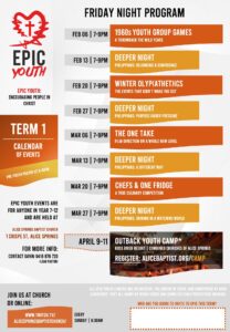 At EPIC Youth we are all about equipping young people to discover, live out, and multiply their faith every day. While we regularly run a Friday night program filled with memorable events and shared experiences, we also know that the best way for young people to grow their faith is to build meaningful relationships with trustworthy adults who not only understand their world, but also have walked those same roads. In summary, we want to be both event and journey orientated.